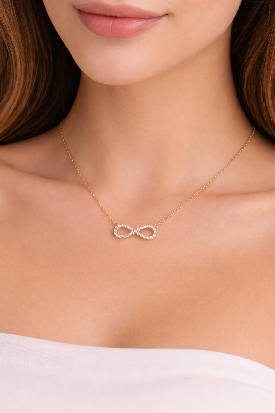 This infinity CZ gold necklace features a timeless design with sparkling cubic zirconia stones. Perfect for daily wear, gifting, and adding elegant shine to any outfit.