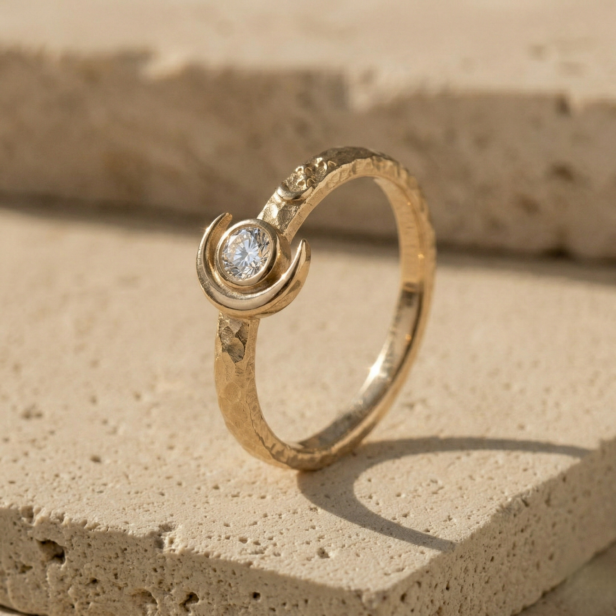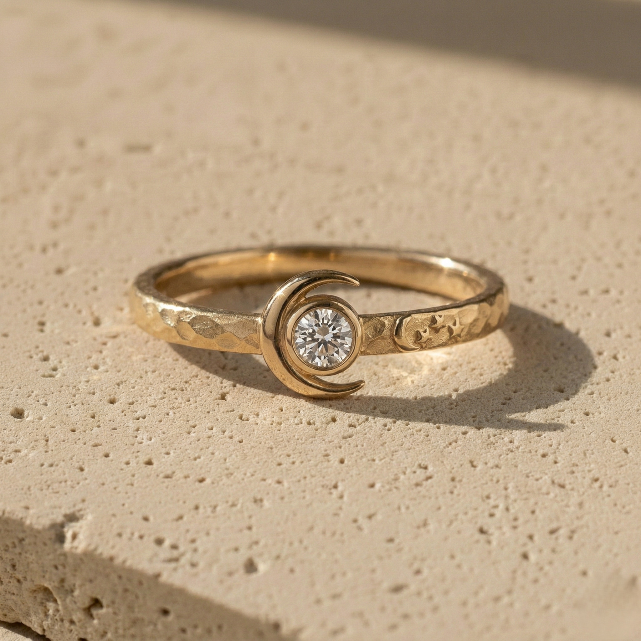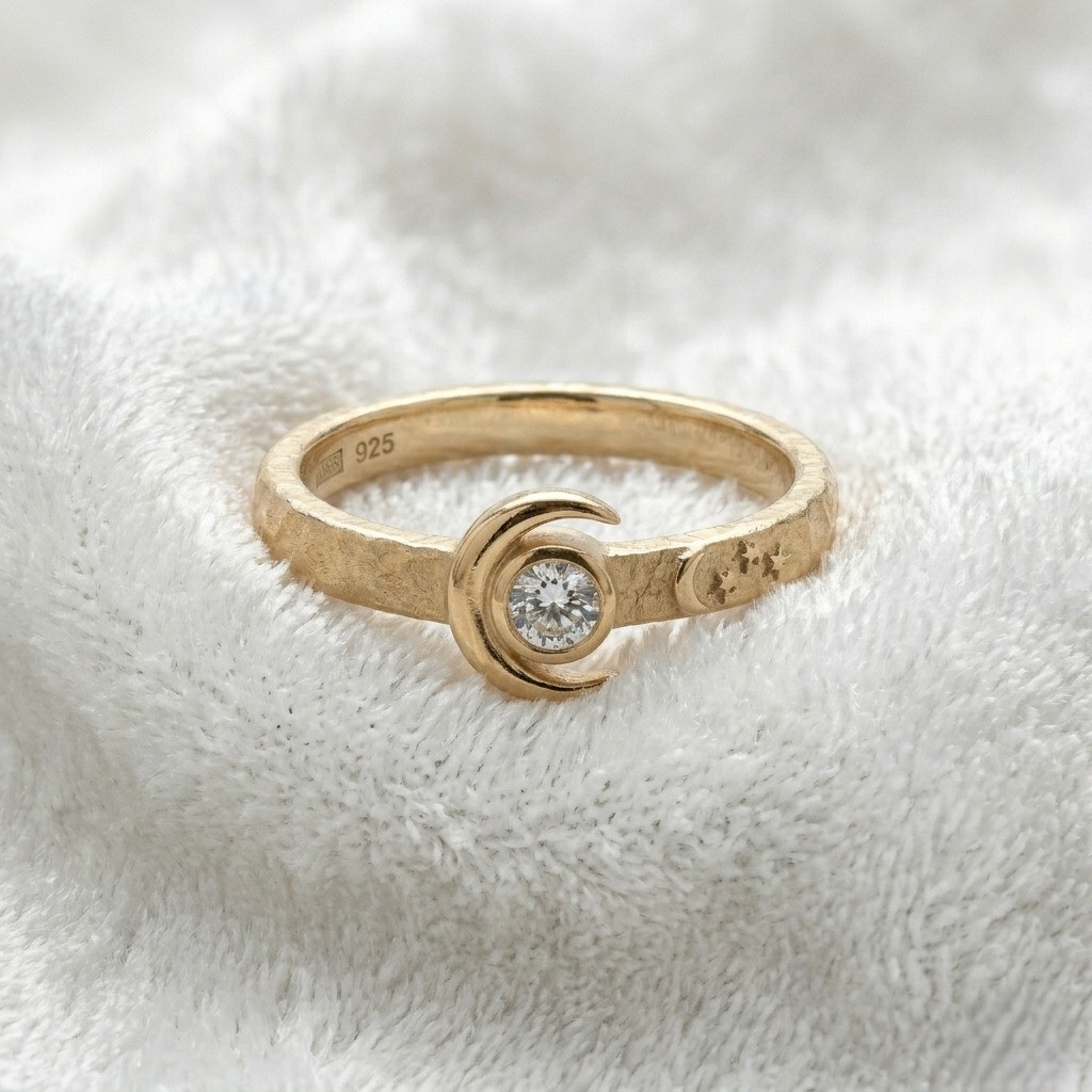 Stylish moon inspired ring with a brilliant stone and subtle star detail, creating a beautiful celestial jewelry look.