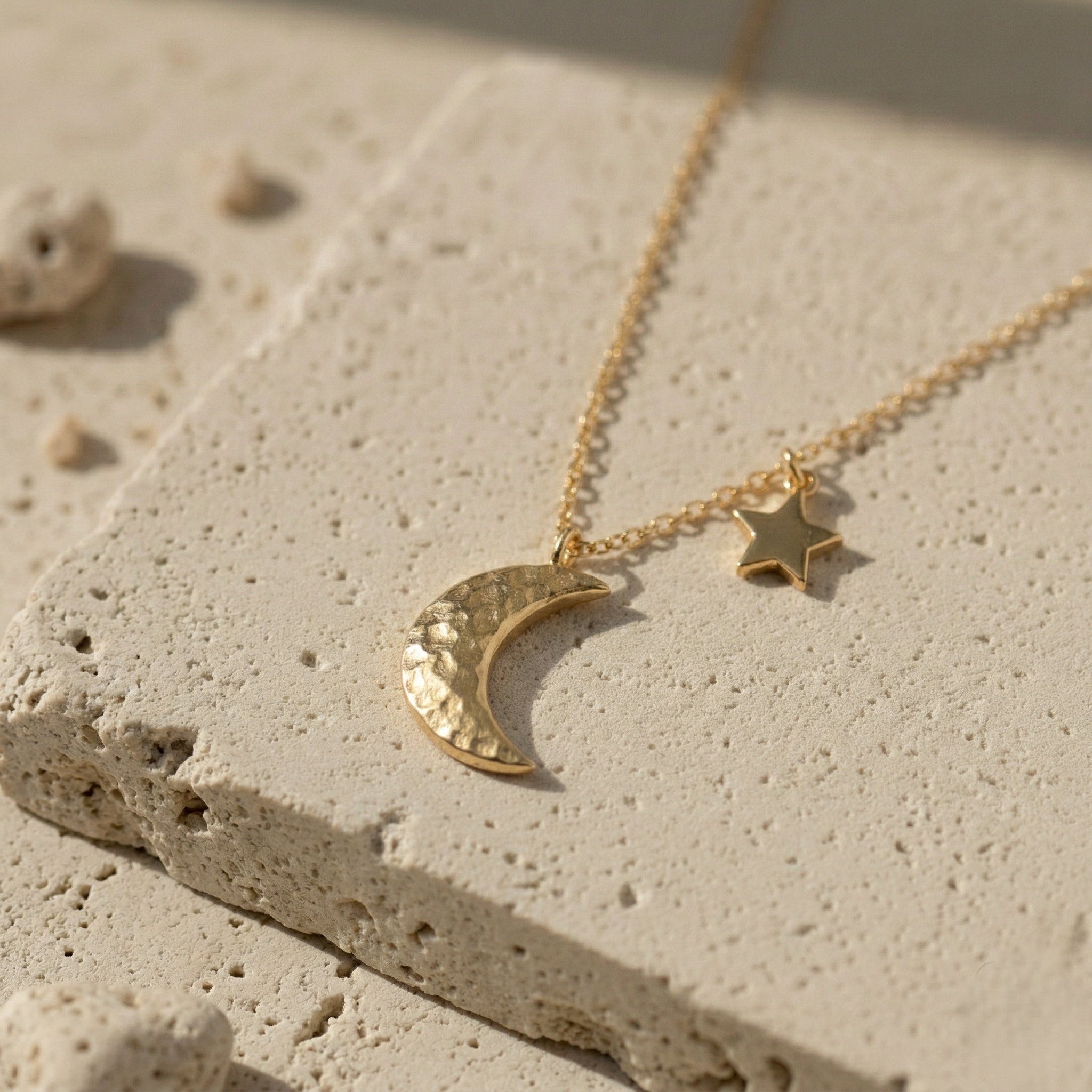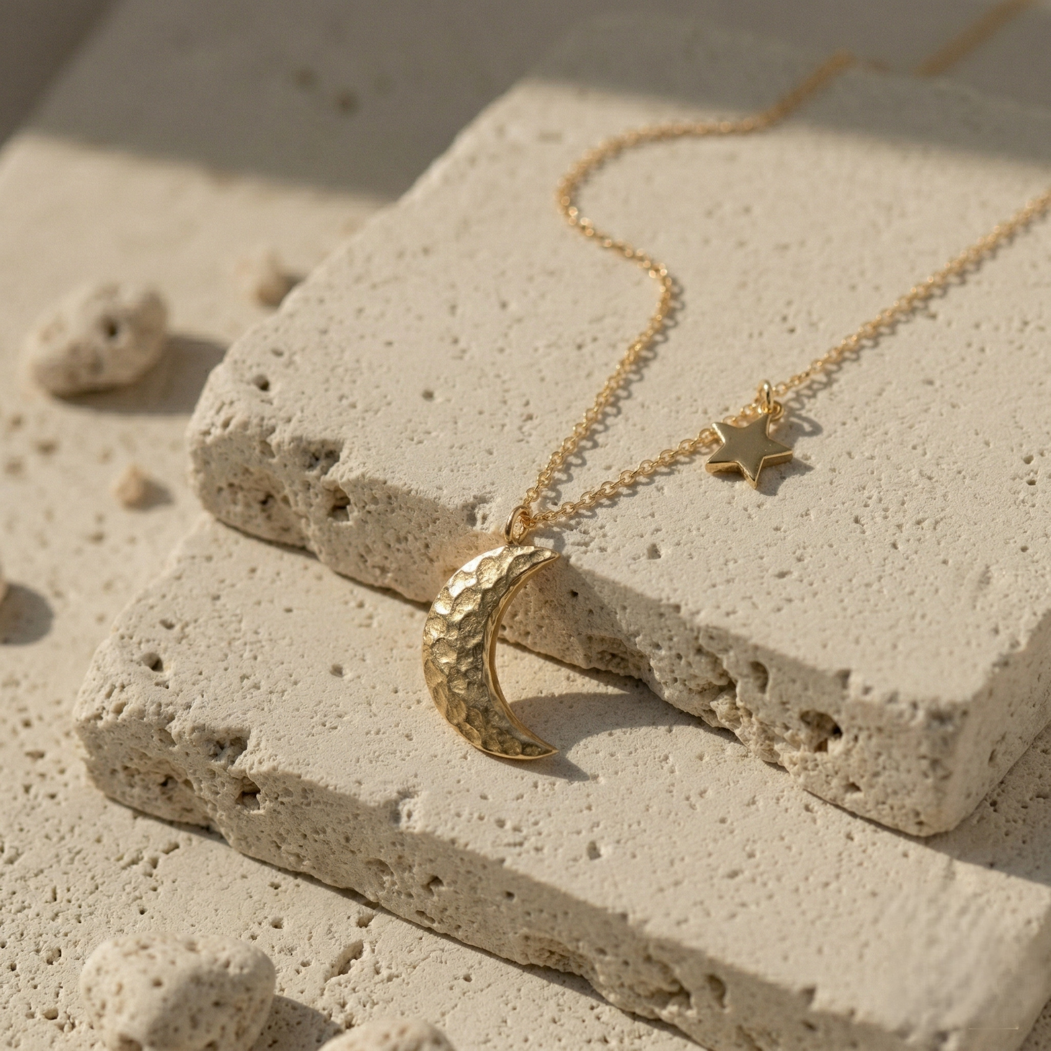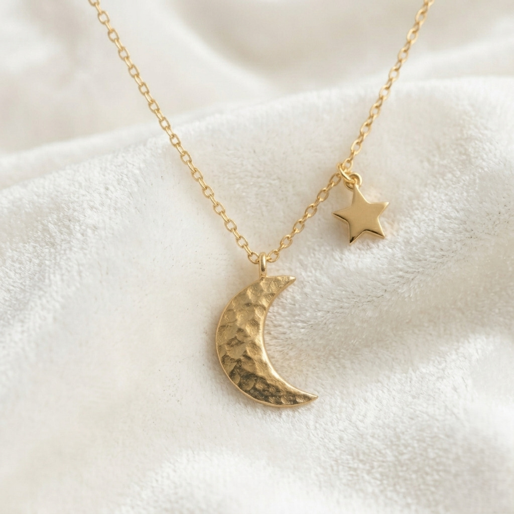 Stylish moon and star charm necklace featuring a hammered crescent pendant and tiny star detail, ideal for modern and elegant jewelry collections.