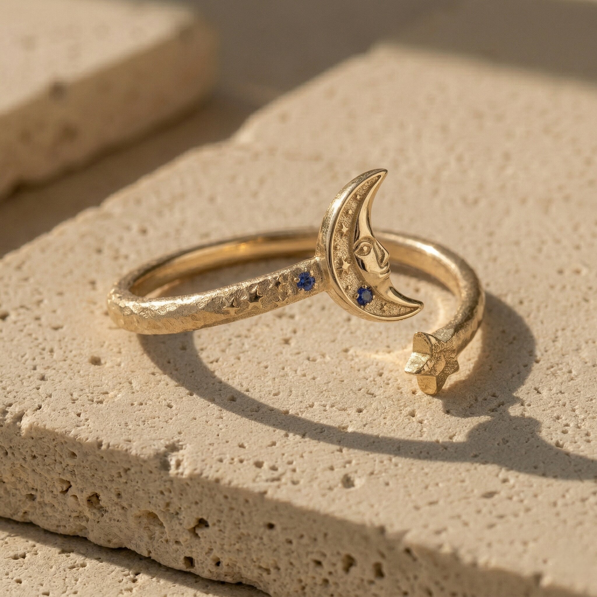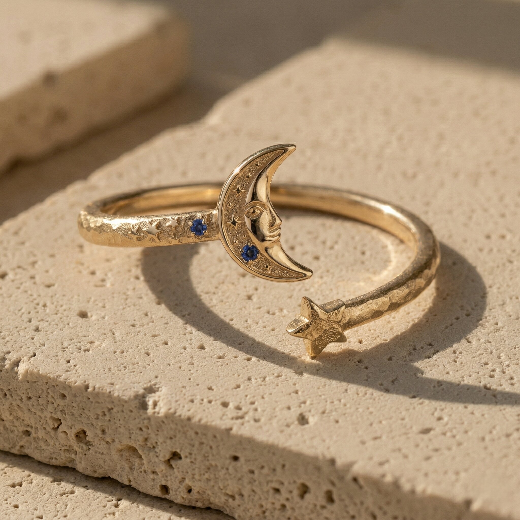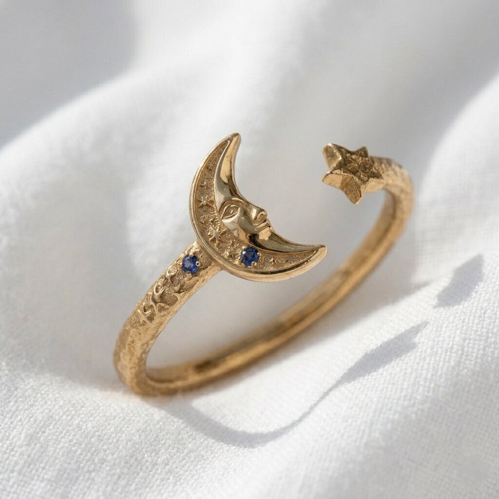Elegant crescent moon face ring with star detail and blue gemstone accents, designed for a stylish and modern celestial jewelry look.