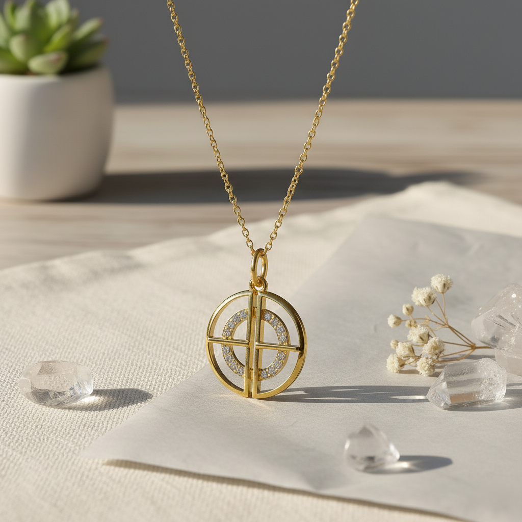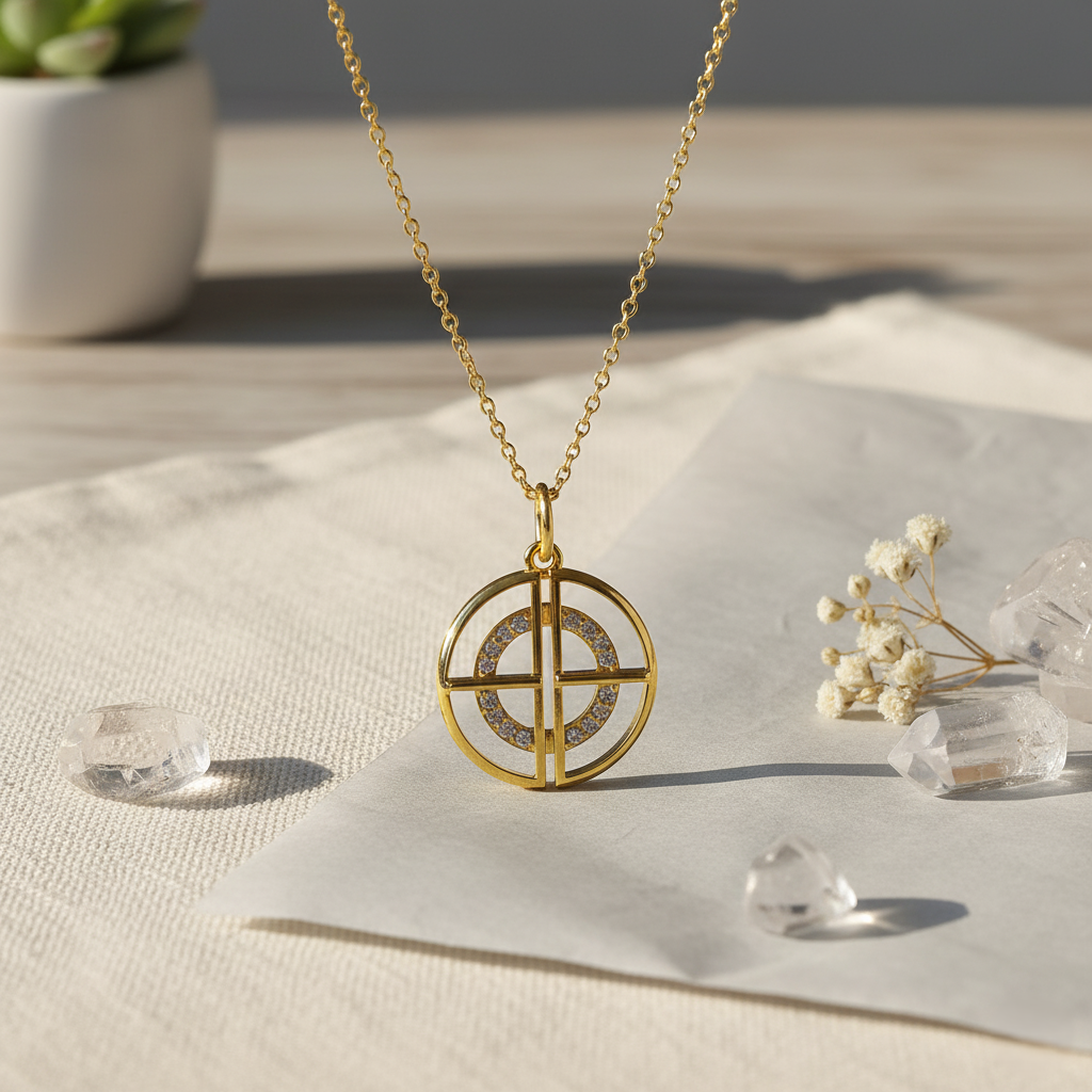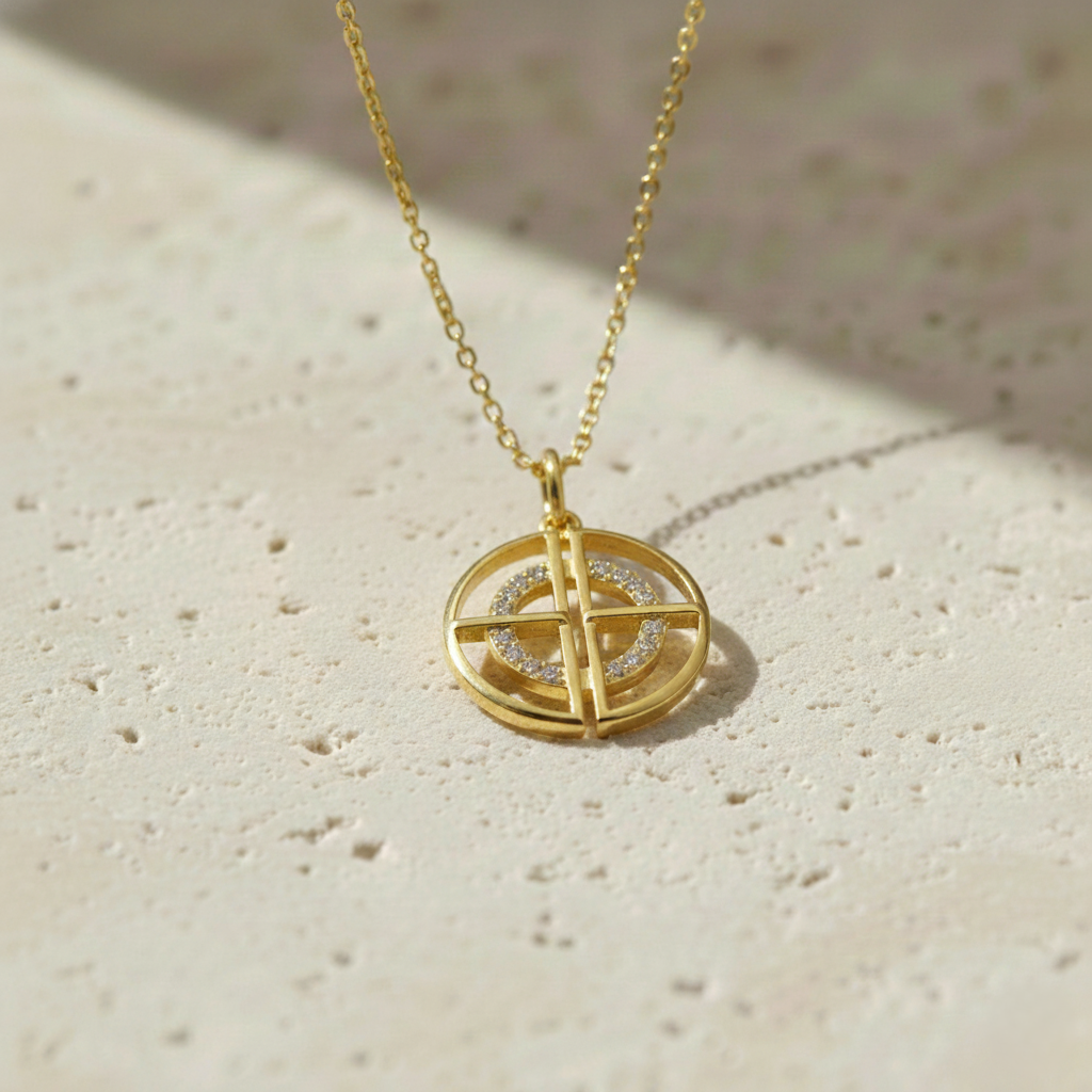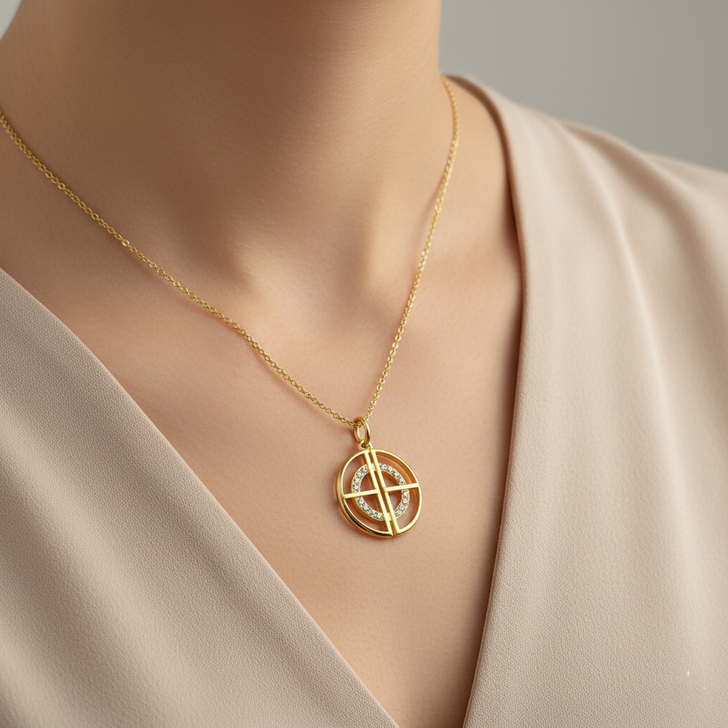 This gold-plated geometric circle pendant features shimmering CZ stones and a modern cross-line design. Lightweight, durable, and perfect for daily wear, parties, and gifting, making it a stylish addition to any outfit.