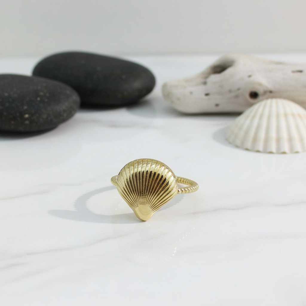 Elegant shell design gold ring with fine detailing and smooth polish, perfect for wholesale collections and modern fashion jewelry brands.