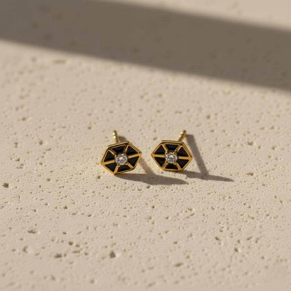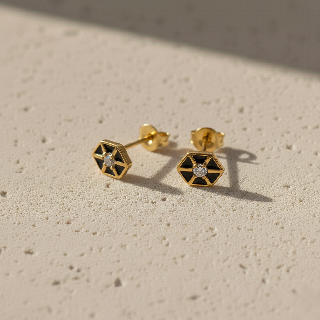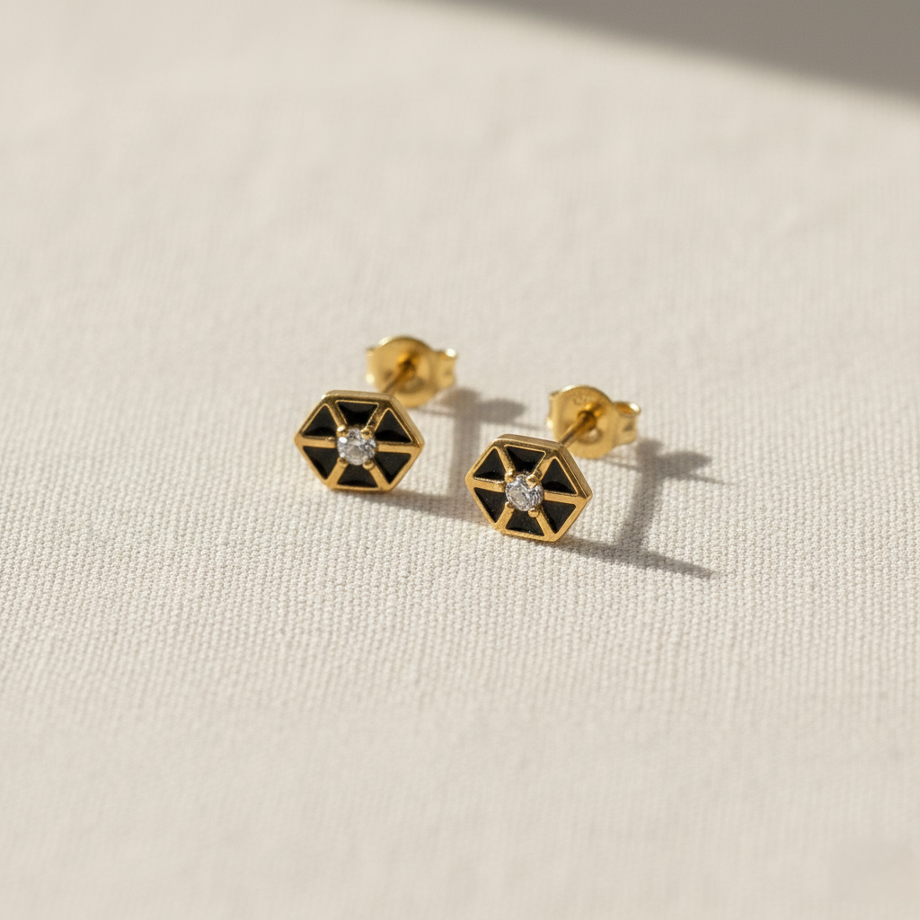 These gold-plated hexagon stud earrings feature black enamel and a sparkling CZ stone for a modern look. Lightweight and elegant, they are perfect geometric earrings for women, ideal for daily wear and gifting.