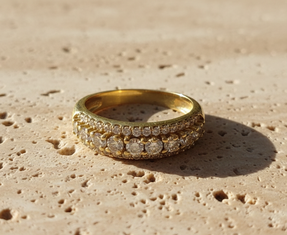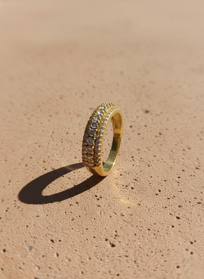 Elegant gold-plated CZ band ring with triple-row sparkling stones, perfect for daily wear, parties, and gifting. Stylish, durable and lightweight jewelry.