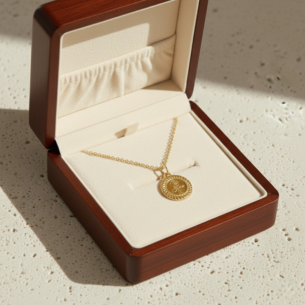 This elegant gold rose coin pendant necklace features a finely engraved floral design with a classic medallion look. A minimal yet stylish necklace ideal for daily wear, layering with chains, and gifting on special occasions.