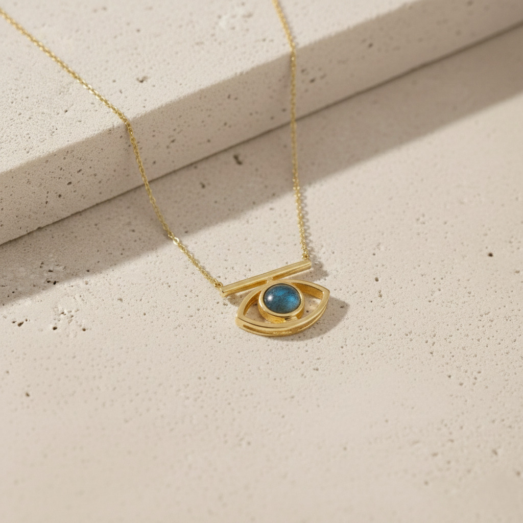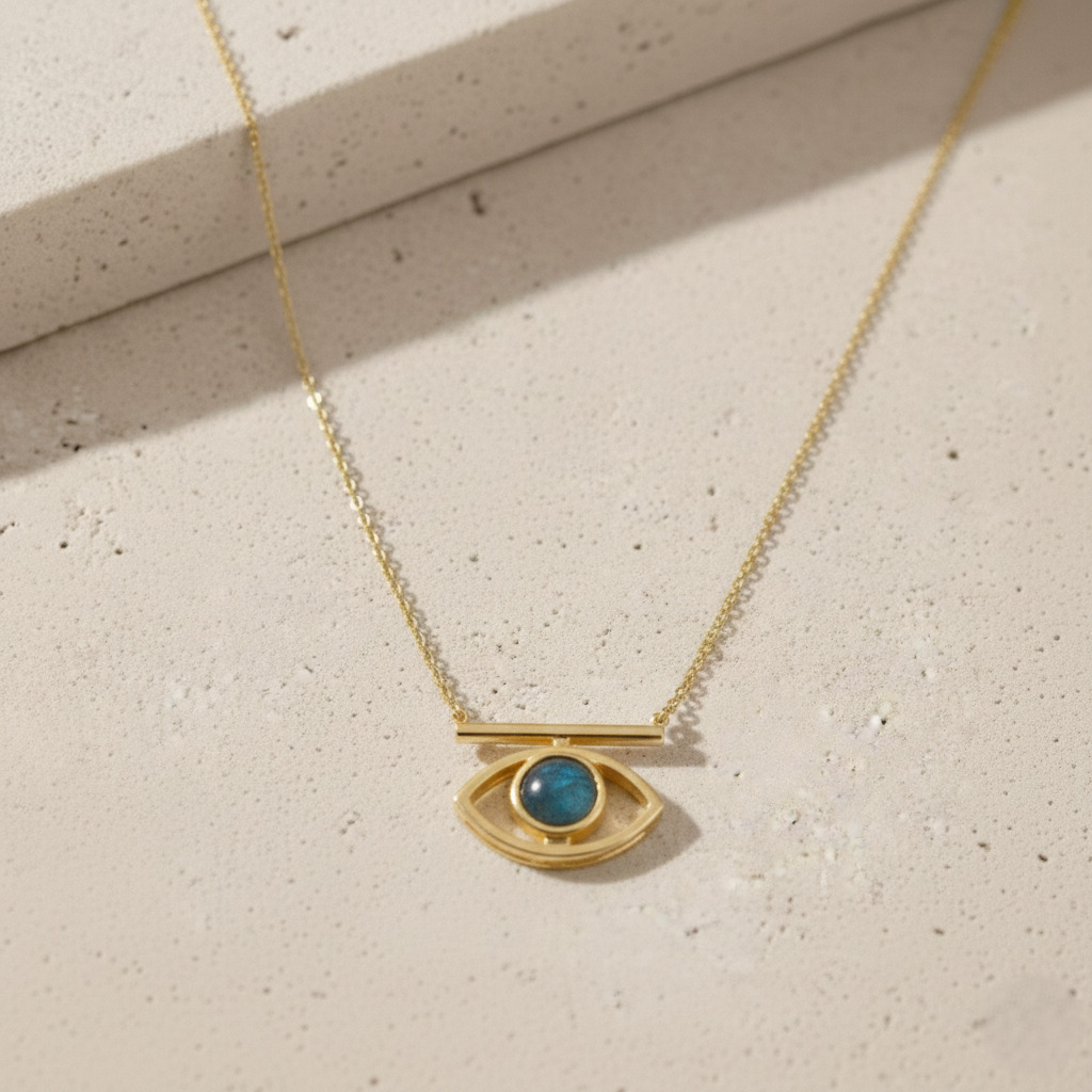 Minimal evil eye pendant necklace featuring a blue stone and sleek gold polish. A trendy handcrafted design ideal for birthdays, anniversaries and special gifts.