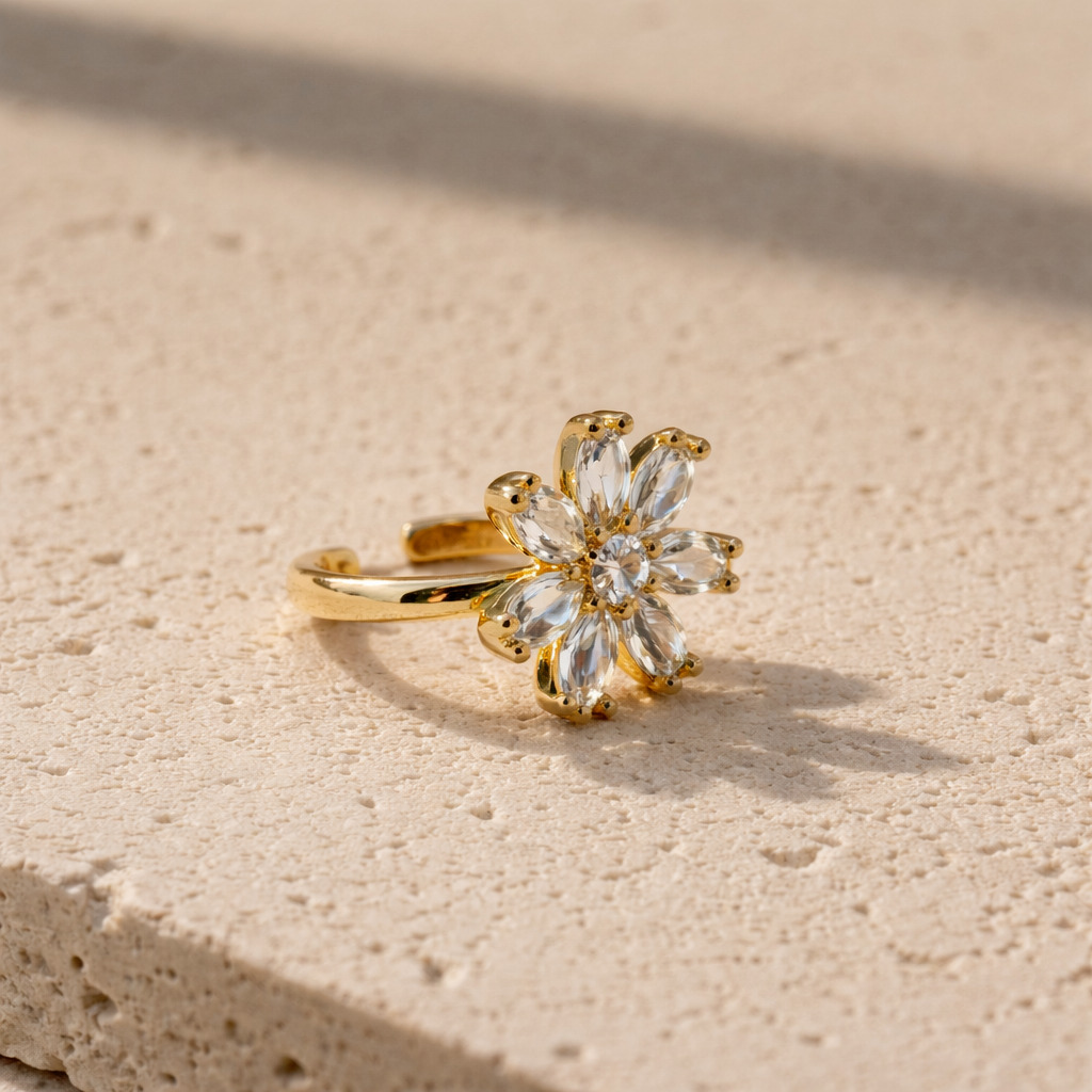 Elegant floral ring crafted in sterling silver with sparkling marquise stones in a flower design and polished gold finish for a luxurious look.