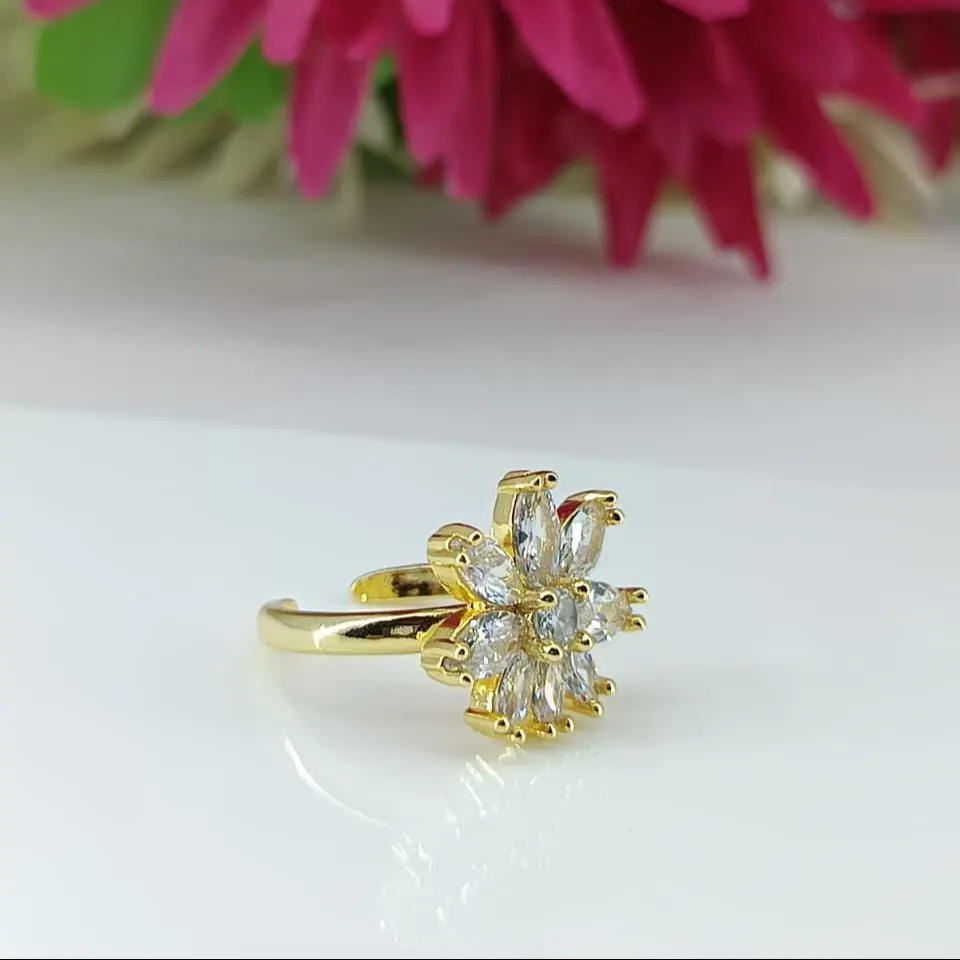 Stylish flower cluster ring made in sterling silver with brilliant marquise stones and gold finish, creating a modern elegant statement look.