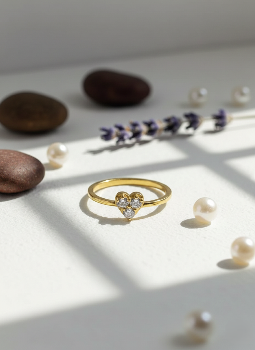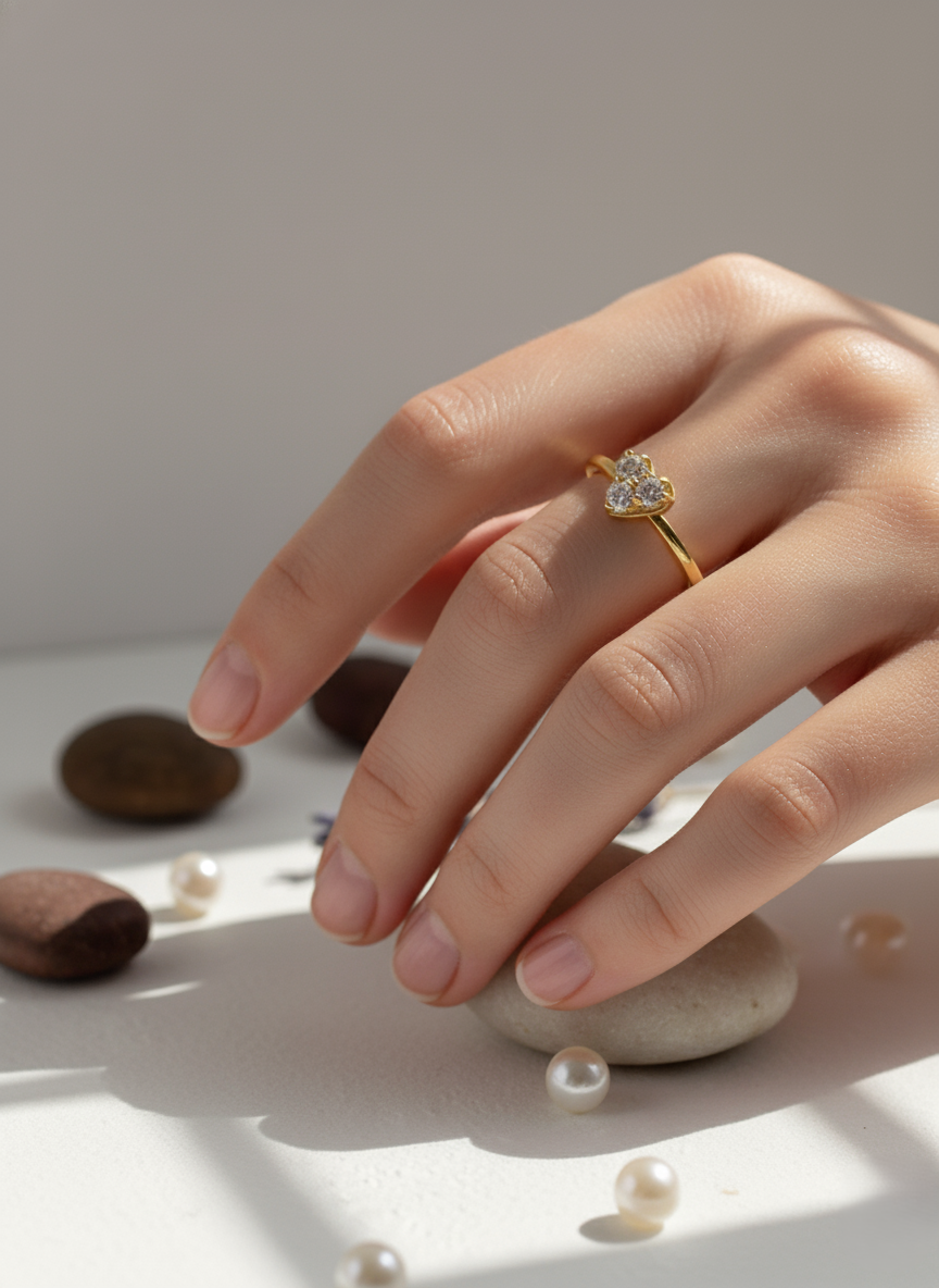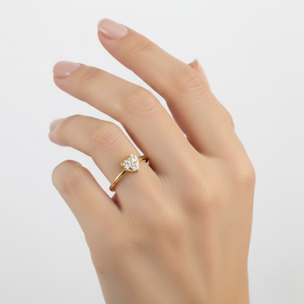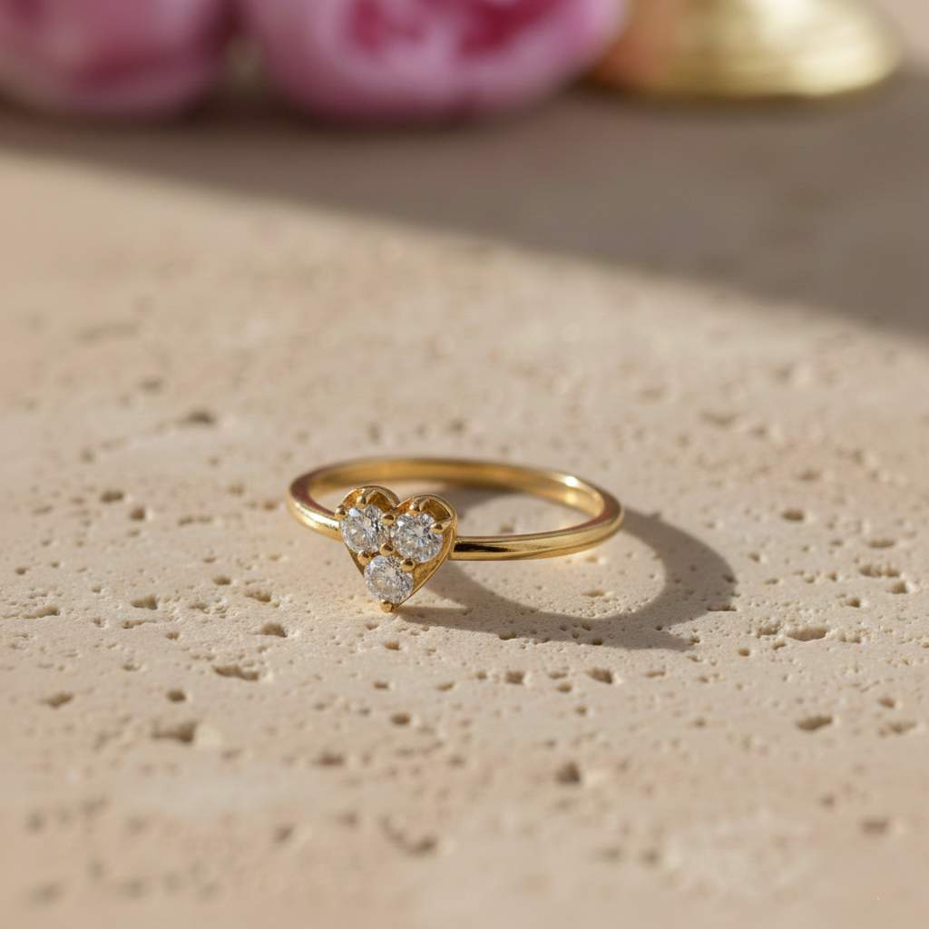 This sterling silver gold plated heart ring features three sparkling cz stones in a delicate heart shape. its minimal and lightweight design is perfect for daily wear, stacking, or gifting, adding a sweet elegant touch.