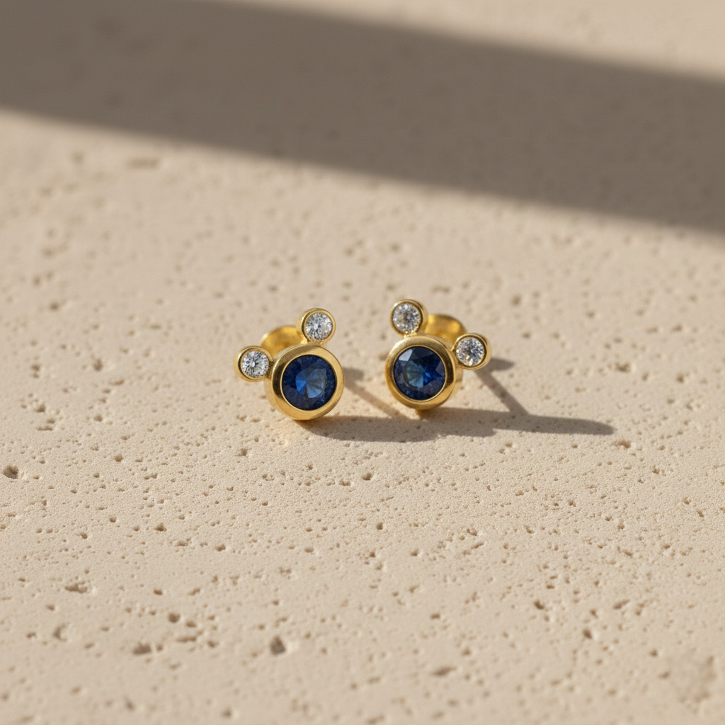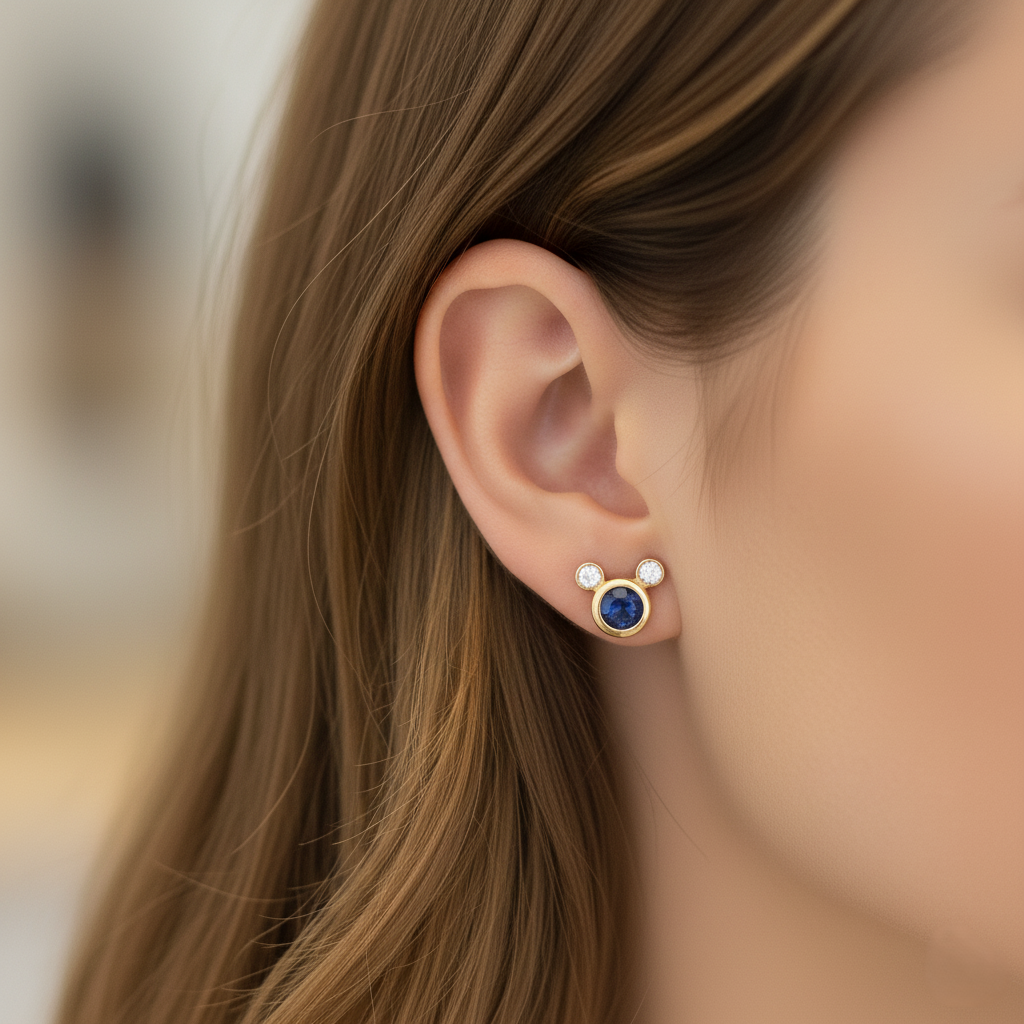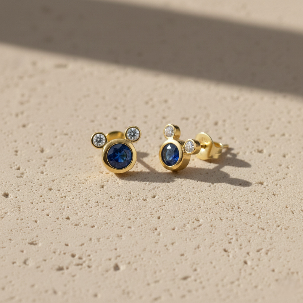 These gold plated Mickey-style earrings feature a deep blue Kyanite stone paired with sparkling CZ accents. Lightweight, cute, and perfect for daily wear, casual styling, gifting, and adding a playful elegant touch.