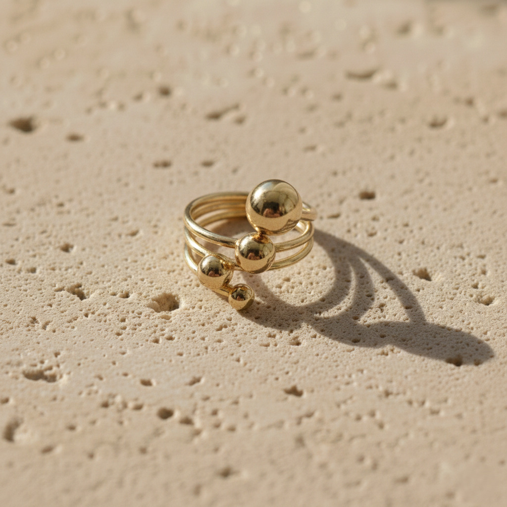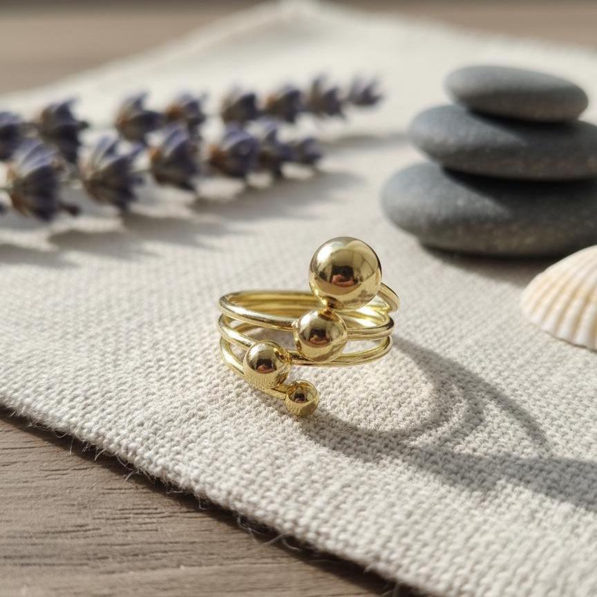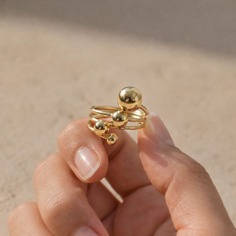 A modern gold bubble ring with polished sphere details and a wrap design. Lightweight, adjustable, and perfect for everyday wear or minimal statement looks.