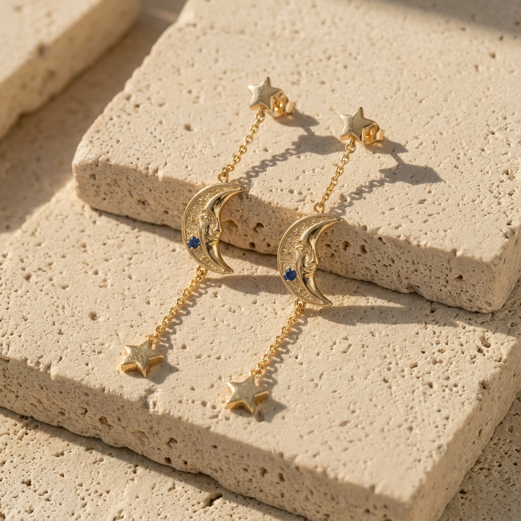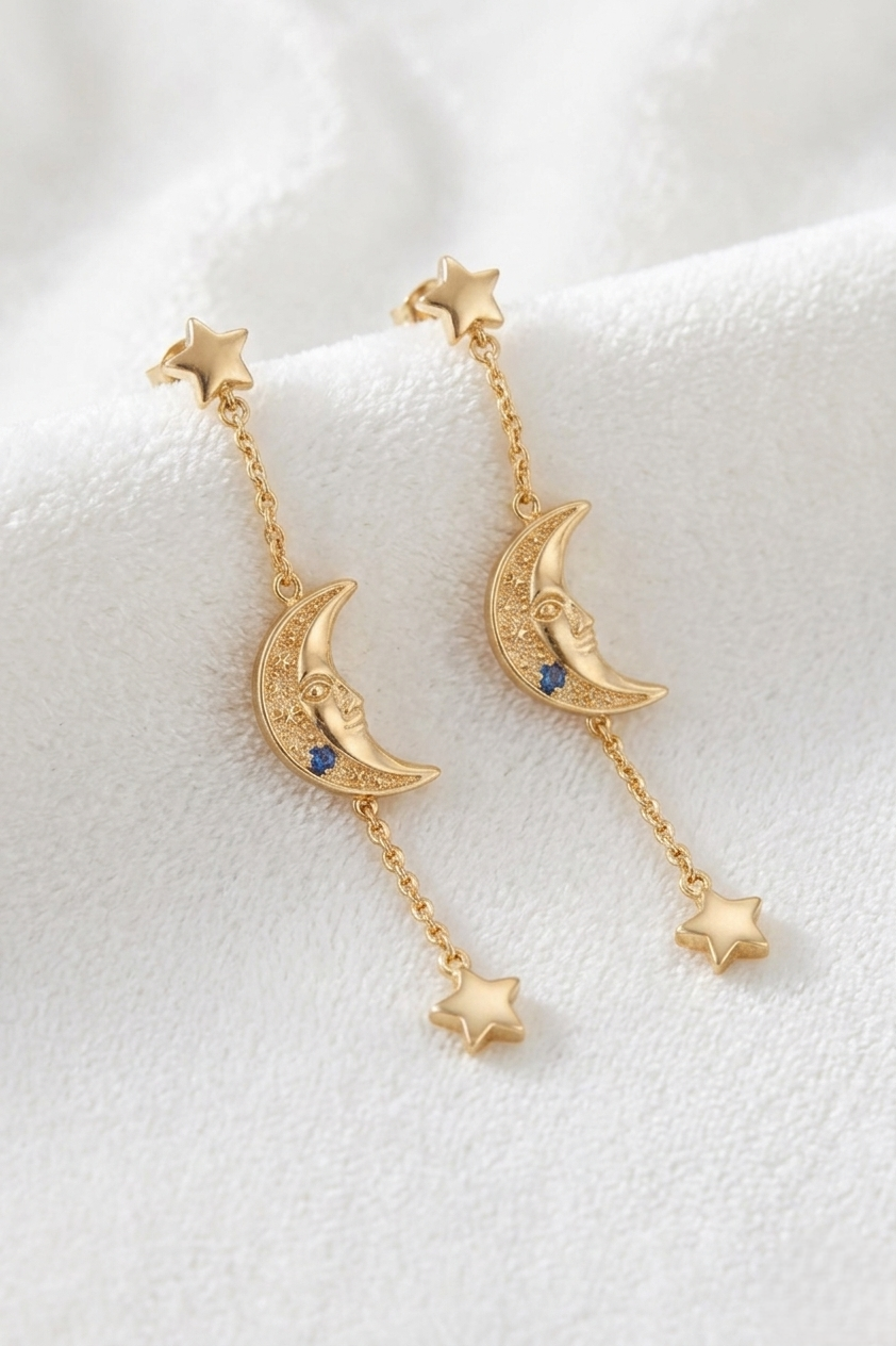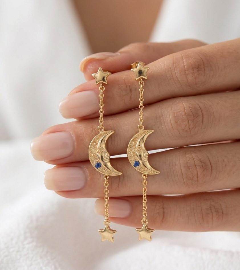 Elegant moon face drop earrings with star chain detail and subtle gemstone accents, perfect for a stylish celestial jewelry look.