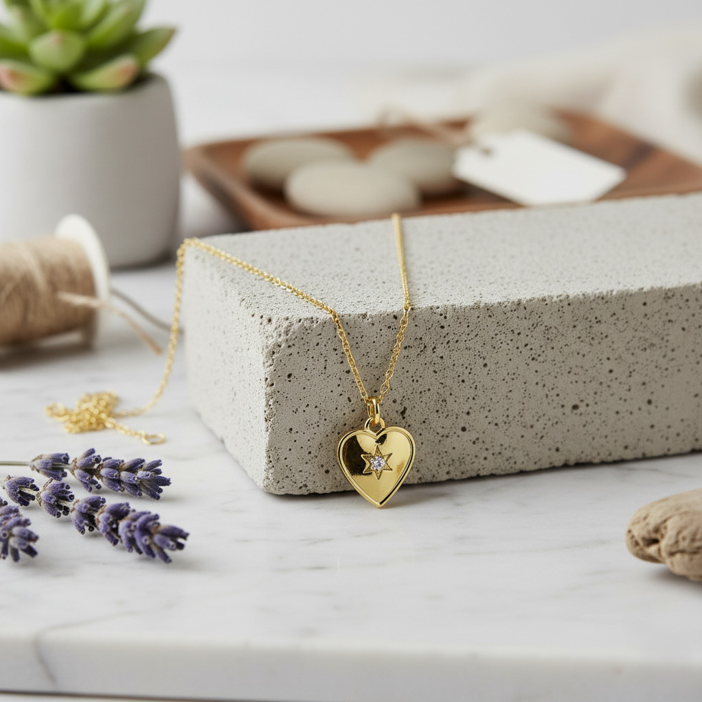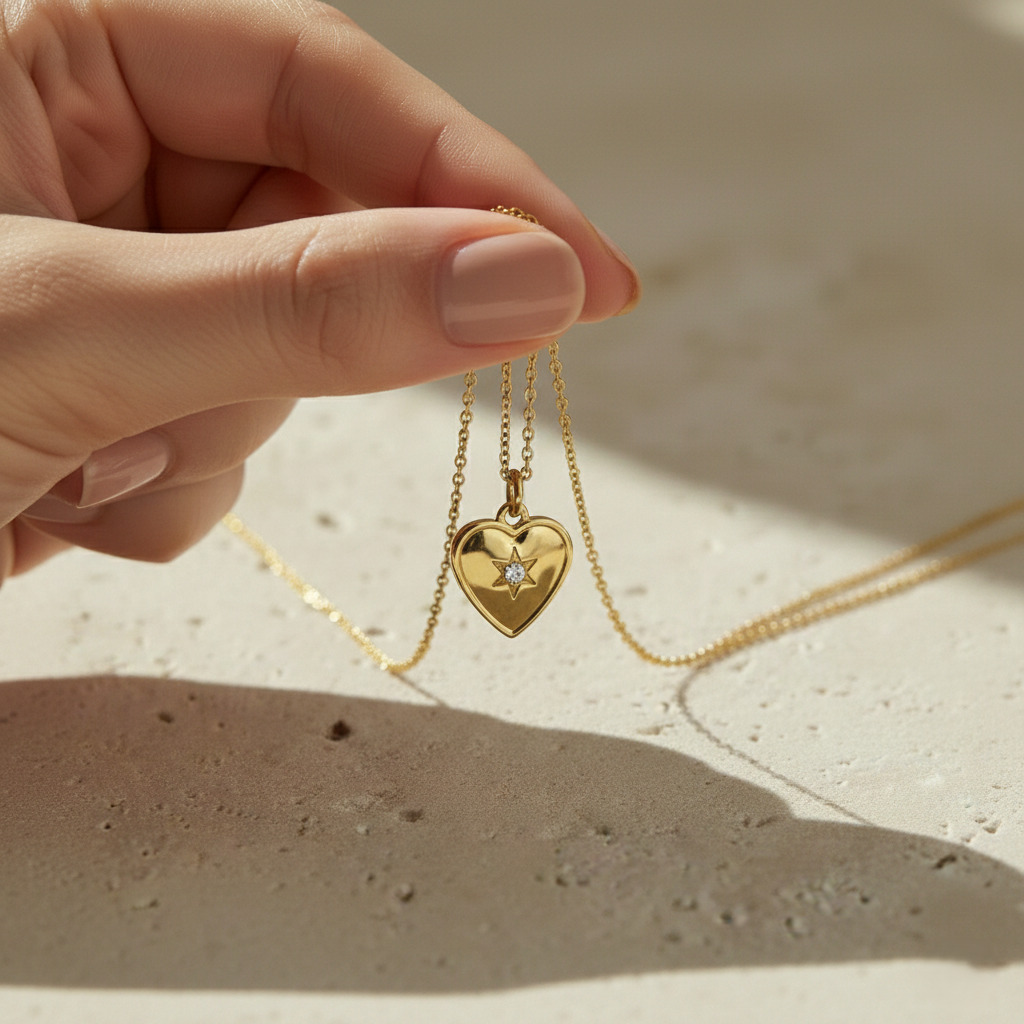 This elegant gold heart pendant necklace features a delicate star cubic zirconia design with a smooth polished finish. Lightweight and classy, it is ideal for daily wear, layering with other chains, and thoughtful gifting for special occasions.