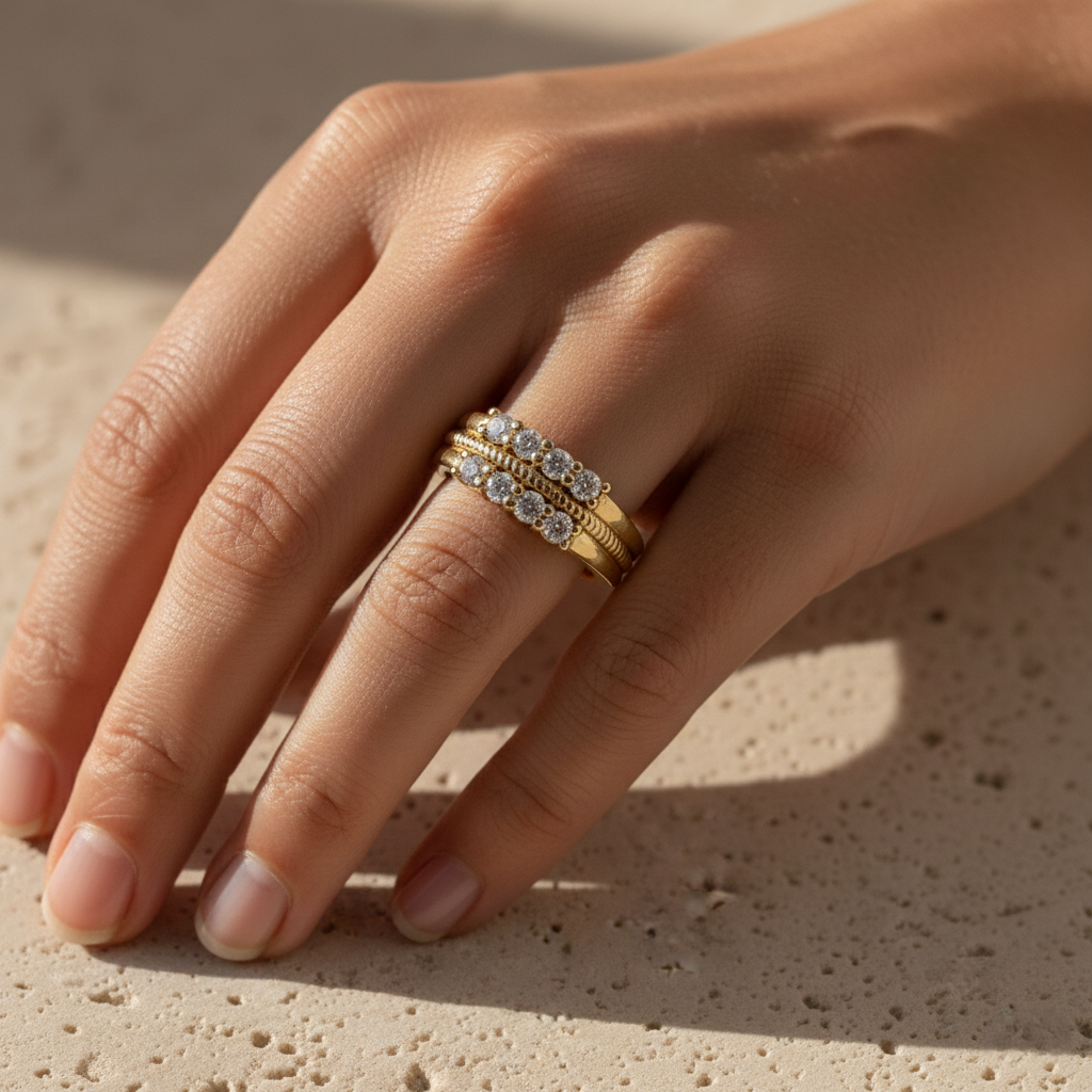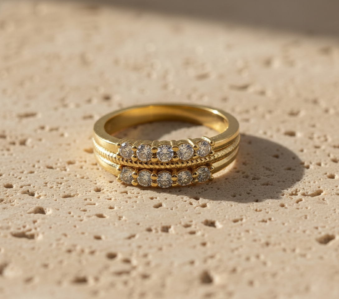 this gold double row half eternity ring features brilliant cubic zirconia stones set in a sleek, modern band. perfect for stacking, gifting, and everyday elegance. crafted with premium detailing by the leading jewelry manufacturer in jaipur for lasting shine.