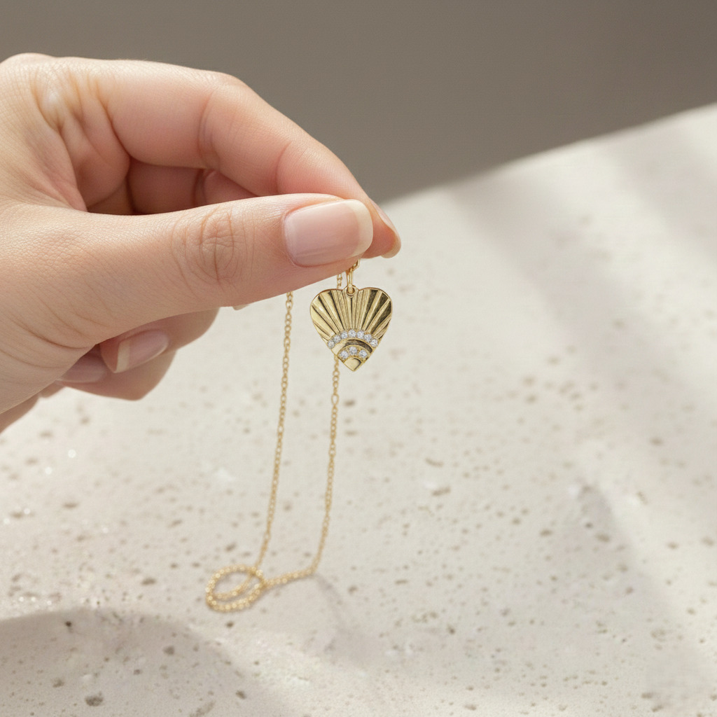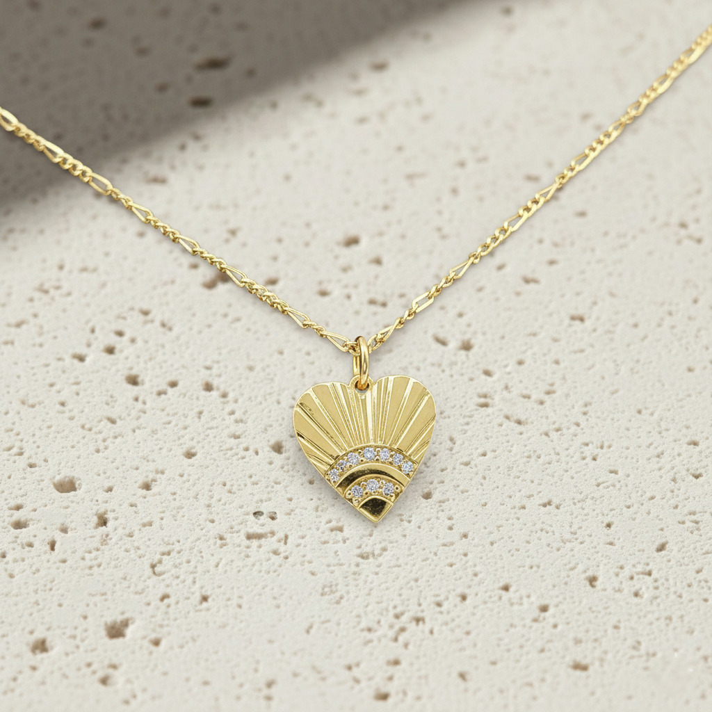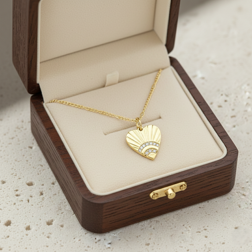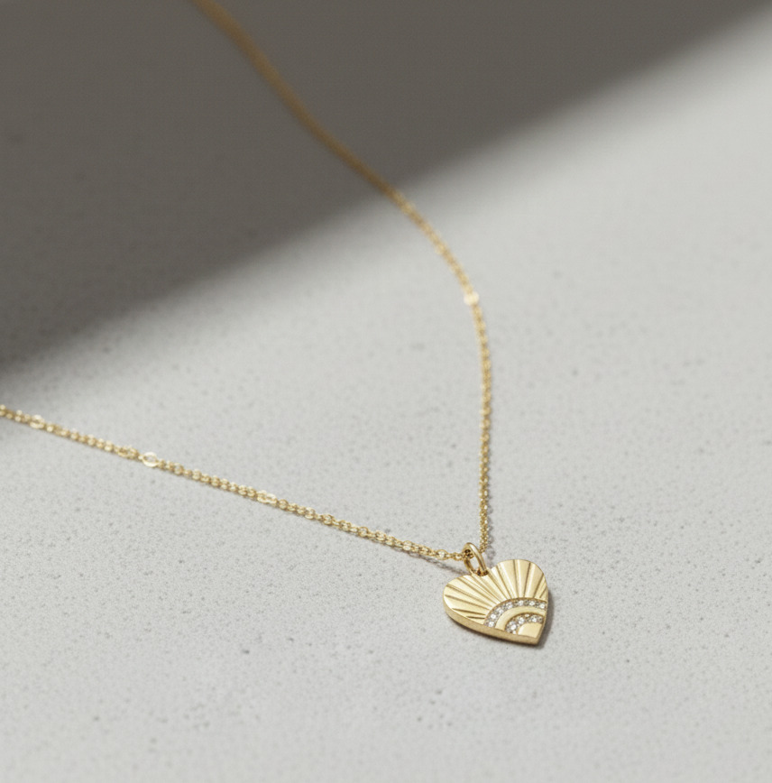This elegant Sunrays Texture gold heart pendant features a radiant sunray-inspired engraved design with subtle CZ accents. Lightweight and refined, it is ideal for daily wear, layering, and special gifting occasions.