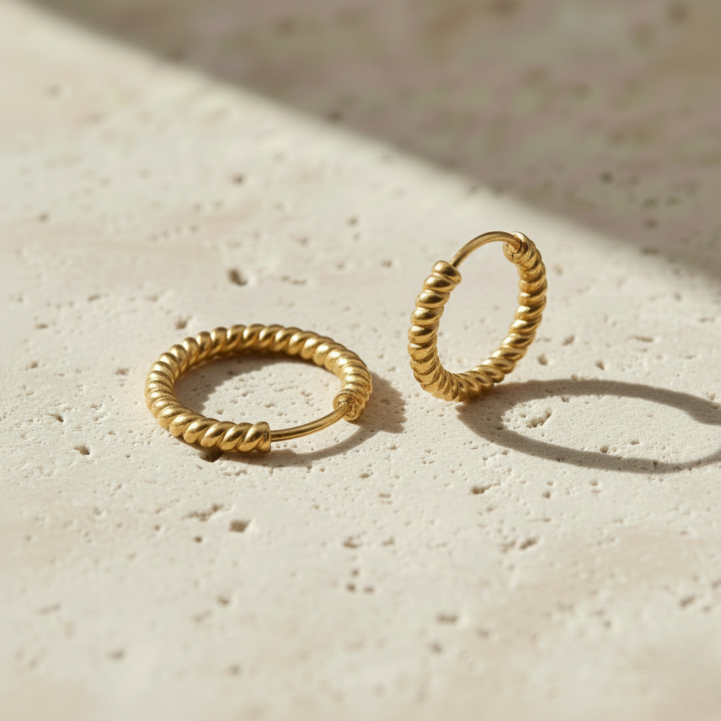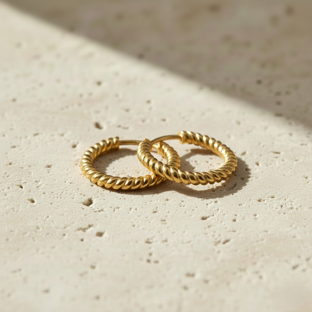 These beautiful twisted gold hoop earrings feature a classic rope texture with a polished shine. Lightweight, durable and perfect for everyday elegance. Designed for comfort and style, these hoops elevate every outfit with a luxurious gold-plated finish.